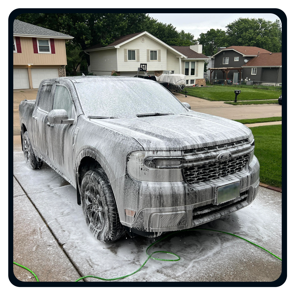 Pressure wash and a through scrub of vehicle exterior including rims, tires, and wheel wells. (Must have hose hook-up this is a mobile service)